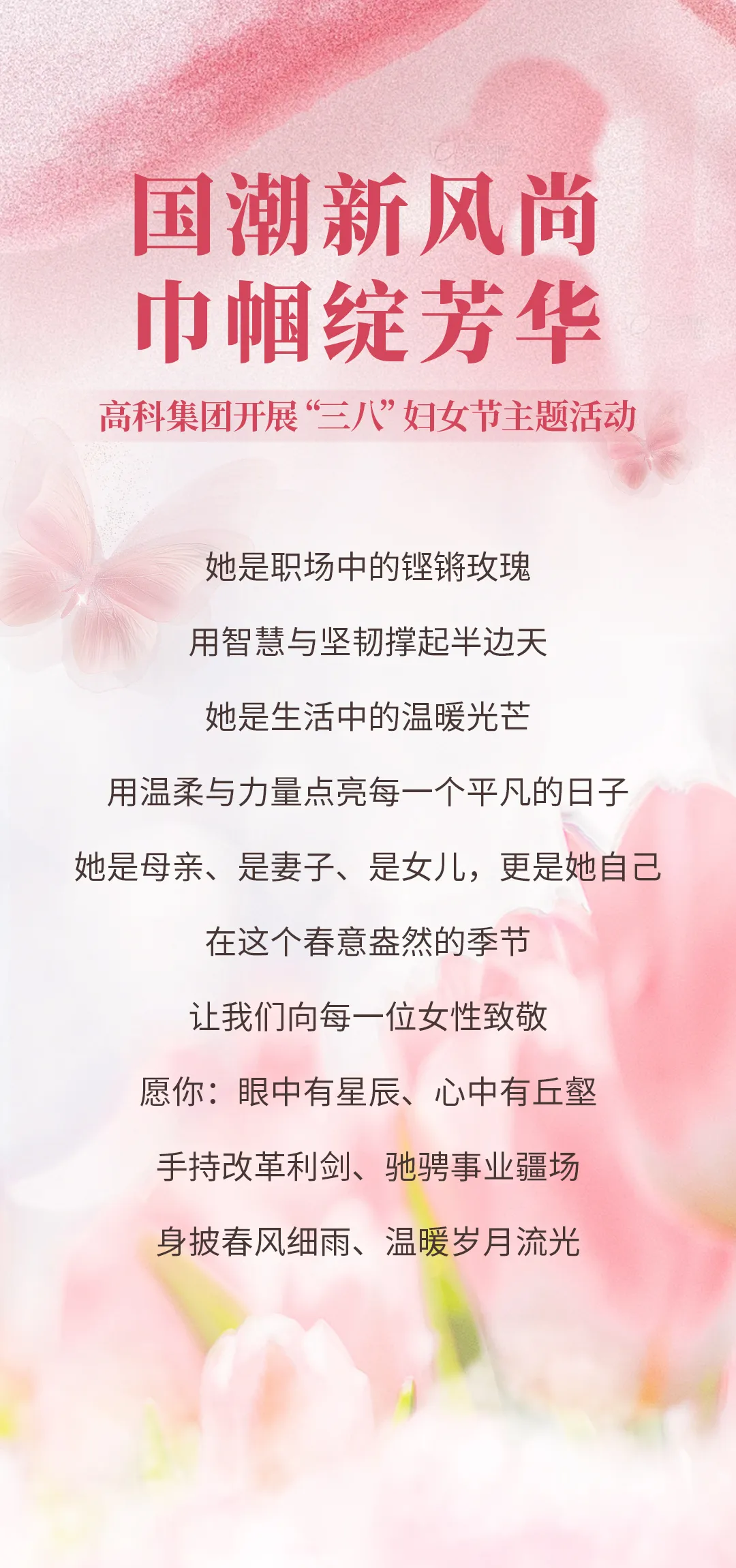 3月7日,高科集團(tuán)婦女聯(lián)合會(huì)舉辦了“國(guó)潮新風(fēng)尚·巾幗綻芳華——高科集團(tuán)國(guó)風(fēng)女神節(jié)”主題活動(dòng),旨在豐富女職工精神文化生活,增強(qiáng)團(tuán)隊(duì)凝聚力,展現(xiàn)中國(guó)女性的優(yōu)雅與風(fēng)采?;顒?dòng)在高科·云水灣青云臺(tái)人文藝術(shù)館舉行,吸引了近200名女職工踴躍參與。高科集團(tuán)黨委書(shū)記、董事長(zhǎng)姚紅波,集團(tuán)黨委委員、副董事長(zhǎng)賀文輝出席活動(dòng)。姚紅波代表集團(tuán)黨委、董事會(huì)向全體女職工致以崇高敬意和節(jié)日問(wèn)候,高度贊揚(yáng)了她們?cè)诩瘓F(tuán)發(fā)展中的杰出貢獻(xiàn),并向全體女同胞們發(fā)出了“爭(zhēng)做三個(gè)先鋒”的倡議,激勵(lì)大家在改革攻堅(jiān)、開(kāi)拓市場(chǎng)和管理創(chuàng)新中繼續(xù)發(fā)揮巾幗力量。